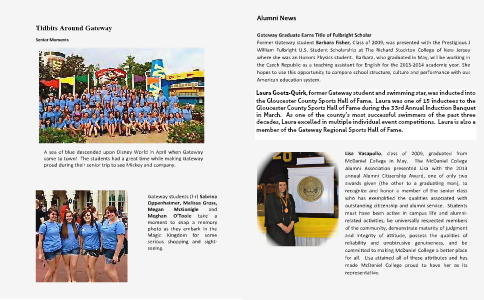 Gateway Graduate Earns Title of Fulbright Scholar Former Gateway student Barbara Fisher, Class of 2009, was presented with the Prestigious J William Fulbright U. S. Student Scholarship at The Richard Stockton College of New Jersey where she was an Honors Physics student. Barbara, who graduated in May, will be working in the Czech Republic as a teaching assistant for English for the 2013-‐2014 academic year. She hopes to use this opportunity to compare school structure, culture and performance with our American education system.