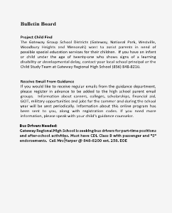 Project Child Find The Gateway Group School Districts( Gateway, National Park, Westville, Woodbury Heights and Wenonah) want to assist parents in need of possible special education services for their children. If you have an infant or child under the age of twenty-‐ one who shows signs of a learning disability or developmental delay, contact your local school principal or the Child Study Team at Gateway Regional High School( 856) 848-‐8210.