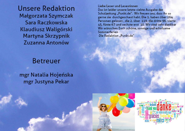 Das ist leider unsere letzte siebte Ausgabe der Schulzeitung „Punkt.de”. Wir freuen uns, dass ihr so gerne sie durchgeschaut habt. Die 1. haben über 264 Personen gelesen , die 2. über 119, die dritte 96, vierte 45, fünte 67 und sechste erst 10. Wir sind sehr dankbar