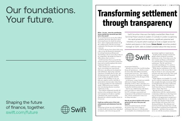 How do you plan to build on this success going into the rest of the year and beyond ? While the initial purpose of Swift Securities View was to improve settlement efficiency , it will also play an invaluable role in helping firms meet upcoming regulatory requirements . Notable market changes include the global rollout of shorter securities settlement cycles . From May 2024 , the US , Canada and Mexico will abandon T + 2 and introduce T + 1 for securities settlements . The EU and UK are currently consulting on T + 1 , and it is expected they will adopt it eventually . While shorter settlement cycles will bring benefits , it also means there ’ s less time for firms to carry out post-trade activities and asset servicing . This could lead to more trade fails and financial penalties . If the industry is to handle T + 1 , it will need to embrace automation and ensure that straight-through-processing ( STP ) is embedded into the entire settlement chain . The ability to track trades via Swift Securities View will help firms achieve these objectives . Moving forward , continued collaboration with the capital markets community will be key to the long-term success of Swift Securities View . In addition to bringing more transparency into the trading lifecycle , we also want to reduce the amount of time people spend dealing with issues that occur during settlement . The ultimate end goal is for Swift Securities View to help prevent these problems from happening altogether – and this is the journey we ’ re on with the securities community .