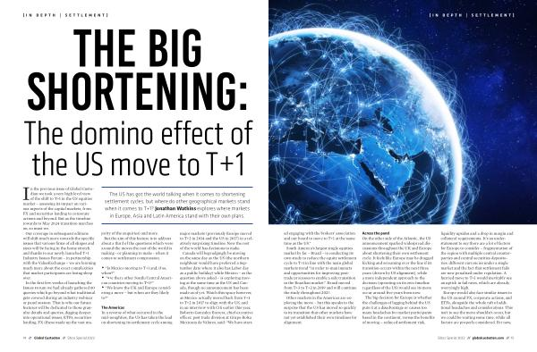 [ I N D E P T H | S E T T L E M E N T ] ed engaging with the brokers ’ association and our board to move to T + 1 at the same time as the US .” South America ’ s largest single equities market by far – Brazil – is conducting its own study to reduce the equity settlement cycle to T + 1 in line with the main global markets trend “ in order to map impacts and opportunities for improving posttrade processes to enable a safe transition in the Brazilian market ”. Brazil moved from T + 3 to T + 2 in 2019 and will continue the study throughout 2023 . Other markets in the Americas are exploring the move – but this speaks to the surprise that the US has moved so quickly to its transition that other markets have not yet established their own timelines for alignment .