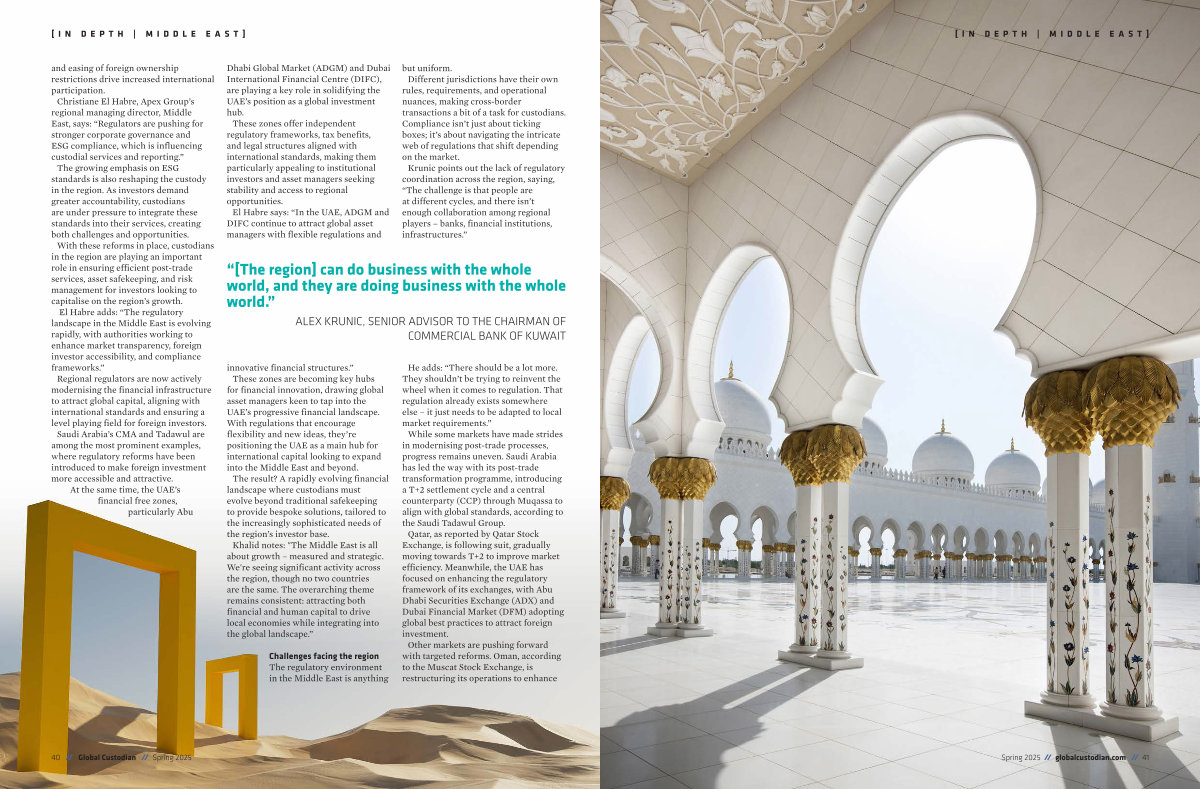 Dhabi Global Market( ADGM) and Dubai International Financial Centre( DIFC), are playing a key role in solidifying the UAE’ s position as a global investment hub. These zones offer independent regulatory frameworks, tax benefits, and legal structures aligned with international standards, making them particularly appealing to institutional investors and asset managers seeking stability and access to regional opportunities. El Habre says:“ In the UAE, ADGM and DIFC continue to attract global asset managers with flexible regulations and but uniform. Different jurisdictions have their own rules, requirements, and operational nuances, making cross-border transactions a bit of a task for custodians. Compliance isn’ t just about ticking boxes; it’ s about navigating the intricate web of regulations that shift depending on the market. Krunic points out the lack of regulatory coordination across the region, saying,“ The challenge is that people are at different cycles, and there isn’ t enough collaboration among regional players – banks, financial institutions, infrastructures.”