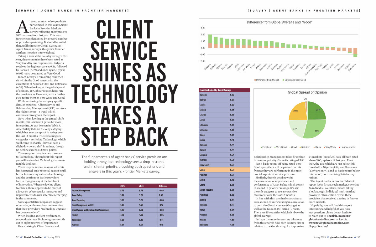 24 markets( out of 26) have all been rated above 5.00, up from 19 last year. Even then, the two which are just below this threshold – Nigeria( 4.86) and Botswana( 4.59) are only 14 and 41 basis points below this cut off, both receiving Satisfactory ratings. The Agent Banks in Frontier Market report looks first at each market, covering 26 individual countries, before taking a look at eight individual multi-market providers. This section covers those providers that received a rating in four or more markets. Hopefully, you will find this report interesting and helpful. If you have any questions please do not hesitate to reach out to Beenish. Hussain @ globalcustodian. com or Lottie. Sweeney @ globalcustodian. com Happy Reading!