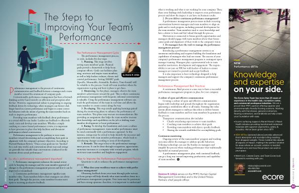 what is working and what is not working for your company . Then , share your findings with leadership to improve your performance process and show the impact it can have on business results . 2 . Do you deliver continuous performance management ? A performance management process must include recurring conversations between managers and team members to align on goals and to track progress , including personal development for the team member . Team members tend to crave knowledge and have a desire to learn and feel valued through the process .