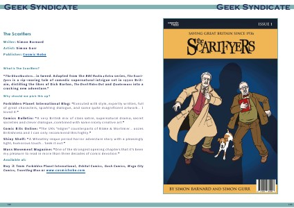What is The Scarifiers? “The Ghostbusters... in tweed. Adapted from the BBC Radio 4 Extra series, The Scarifyers is a rip-roaring tale of comedic supernatural intrigue set in 1930s Britain, distilling the likes of Dick Barton, The Devil Rides Out and Quatermass into a cracking new adventure.” Why should we pick this up? Forbidden Planet International Blog: “Executed with style, expertly written, full of great characters, sparkling dialogue, and some quite magnificent artwork... I loved it.” Comics Bulletin: “A very British mix of class satire, supernatural drama, secret societies and clever dialogue, combined with some nicely creative art.” Comic Bits Online: “The UKs “edgier” counterparts of Blake & Mortimer... oozes Britishness and I can only recommend this highly.” Shiny Shelf: “A Wheatley-esque period horror adventure story with a pleasingly light, humorous touch... Seek it out.” Mass Movement Magazine: “One of the strongest opening chapters that it’s been my pleasure to read in more than three decades of comic devotion.” Available at: Buy it from Forbidden Planet International, Orbital Comics, Gosh Comics, Mega City Comics, Travelling Man or www.cosmichobo.com.