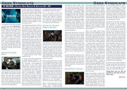 characters show what they can do and how they interact on a more regular basis. Tom’s kids dynamic is increasingly interesting, especially with the presence of rescued Ben, struggling with the trauma of abduction and harnessing, mixed in with the more normal trauma of being a middle child with a somewhat overachieving elder brother. It’s nice to see how Pope has fit himself in, and nice to see he retains his role as snarky Sawyer-from-Lost rip off that he always has been. The story also gives a nice (if that’s the word) bit of Body Horror with the “bug” that’s been planted on Tom; a really well implemented, wrenching bit of TV that serves both to make the viewer uncomfortable, but to establish the idea that Tom may no longer be trustworthy, even in his own eyes. It feels like the establishment of a storyline that will run for a bit, and hope that it is. By the end of the episode, Falling Skies feels like a show a lot more comfortable in its own skin; a show that at the very least knows where its balance should be and is working very hard to get there. Long may it continue.