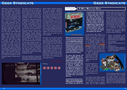 games. We own half a dozen or so of their boxed games already, and have always been impressed by their production quality and general playability. X-Wing follows their general design philosophy of high-end playing pieces but has apparently tossed out their customary sprawling, jumbled mess of a rulebook in favour of something a lot more tightly written and designed. Here’s what you get in the box: • Three pre-painted starfighter miniatures (one XWing and two TIE Fighters) • Quick-start mini-rulebook • Full rulebook • Range and manoeuvre rulers • Custom dice • Enough counters, cards, pilot tokens and sundries to choke a Gundark