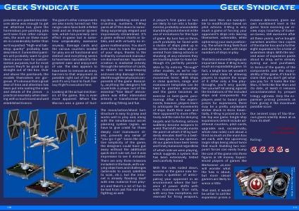 ing dice, scribbling notes and crunching numbers, X-Wing pares all of this down to something surprisingly elegant and impressively streamlined. It’s a game without charts or tables, and with virtually no ingame mathematics. You don’t even have to track the speed of your ships, thanks to the brilliantly conceived manoeuvre dial mechanism. Squadron creation is mediated entirely through the selection of cards, so there’s no book-keeping and even ship damage is handled through the physical components of the game. Basically, anything the designers felt could kick a player out of the essential “Star Wars” atmosphere was either eliminated entirely or transformed into something fitting and fun. The move/action/shoot turn structure is easy to grasp and works well in play and, along with the simultaneous secret planning system (again, we have to give credit for those deeply cool manoeuvre dials), prevents any sense of “you-go-I-go”. Given the relative simplicity of the game, the designers could have got away without the additional quick-start rule-set, but it was impressive to see it included. There are only three missions included in the book, with varying objectives and challenges (asteroids to avoid, satellites to scan, etc.), but the internet is already flooding itself with new material from players and there’s a lot of fun to be had from just flat-out dogfighting as well.