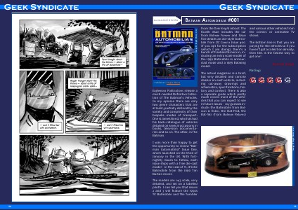 from the Dark Knight reboot. The fourth issue includes the car from Batman Forever and Issue five details an old-style batmobile from DC Comics Issue 400. If you opt for the subscription (which I am doing), there’s a bunch of freebies thrown in, including an extra scale model of the 1989 Batmobile in armourclad mode and a 1989 Batwing model. The actual magazine is a brief, but very detailed and concise dossier on each vehicle, including cut-away drawings and schematics, specifications, history and context. There is also a separate guide which pretty much covers most of the vehicles that you can expect to see in future issues – my guesses include: the Batmobile from Batman & Robin, the Bat-Pod, the Bat-Ski (from Batman Returns)