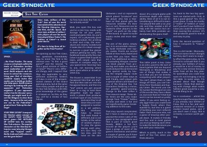 (between 2 and 12) represents which planet “produces” and the player who has a Starbase on that planet gets the resources (whether it’s their turn or not). Resources can be traded to other players, to the “bank” via ports on the edge of the board, or spent to build supply routes and more starbases. The aim of the game, simply put, is to accumulate resources, build starbases and supply routes. Points are scored based on how many bases and routes that you have. There are a few additional wrinkles; a marauding Klingon counter can block planets from producing and make you discard cards and points can be scored from special cards, by having the longest supply route and a couple of other ways as well. Finally, each player gets a special action card based on one of the Original Star Trek Characters featuring a minor, but possibly game-winning, change to the rules (often a free resource swap). These latter items are the only major change from “Classic” Settlers of Catan and seem a fun and not significantly game-breaking addition to the rules. That may sound complicated, but I have in essence just explained the entire rules of the game in two paragraphs and that is part of Catan’s great beauty. Within a full turn around all the players you’ll have a grasp of most of the game’s mechanics and within a couple of games you’ll have most of the tactics fully understood. It’s a simple game with enormous depth and replayability. Best of all it is not intimidating or difficult to learn. I’ve played this with a six year old, and they needed a bit of help with the tactics but certainly had little problem understanding the game itself.