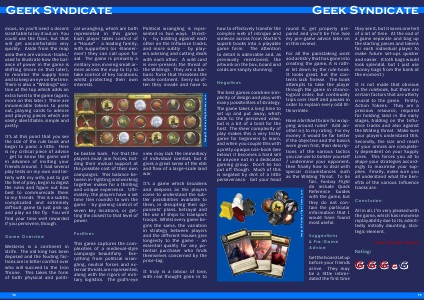 mous, so you’ll need a decent sized table to lay it out on. You could use the floor, but that will get uncomfortable very quickly. Aside from the map area there are various ‘tracks,’ used to illustrate how the balance of power in the game is shifting (more on that later), to monitor the supply lines and to keep an eye on the time. There is also a “Wildings” section at the top which adds an extra twist to the game (again, more on this later.) There are innumerable tokens to press out, playing cards to admire and playing pieces which are easily identifiable, simple and pretty. It’s at this point that you see the size of the rule book and begin to panic a little. Here is my critical piece of advice – get to know the game well in advance of inviting your friends around. I had several play tests on my own and latterly with my wife, just to get the feel of play, begin to digest the rules and figure out how best to communicate them to my friends. This is a subtle, complicated and extremely difficult game to just pick up and play on the fly. You will find your time well rewarded if you persevere, though. cal wrangling, which are both represented in this game. Each player takes control of a “House” – a leading family, with supporters (or ‘Bannermen’) they can call upon for aid. The game is primarily a military one, moving small armies across the map to try to take control of key locations, whilst protecting their own interests. Political wrangling is represented in two ways. Directly – by bidding against each other on the Influence tracks, and more subtly – by players advising and cutting deals with each other. A wild card is ever-present; the thre ]?H?[[???^H\?HH?\??\?X????H]?X][??H??H??[?[??]?\?H???[?^H[??YH[?]?H?[XY?H0?H?[?\?H?Y??[Y\??L????H?X][??X????]H^Y\??]\???[????\??Y[??Z\?]]X[?\?]H???X?H????Z\????[\ZY??\??[[??H?]?Y[?[?Y?Y?[??[????[????]\?XZ?\???H?[[??[?[?\]YH^\?Y[??K?[[X][KH^Y\??]?HH?][YH