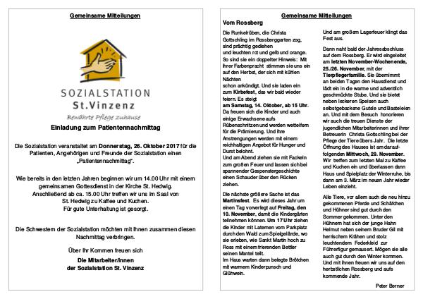 Die Sozialstation veranstaltet am Donnerstag, 26. Oktober 2017 für die Patienten, Angehörigen und Freunde der Sozialstation einen „ Patientennachmittag“.