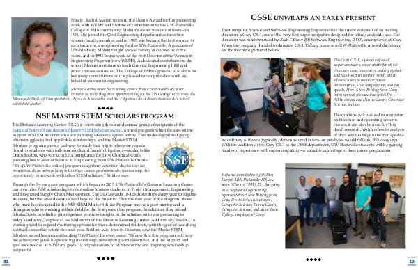 Finally, Rachel Mahun received the Dean’ s Award for her pioneering work with WEMS and lifetime of contribution to the UW-Platteville College of EMS community. Mahun’ s career was one of firsts— in 1980, she joined the Civil Engineering department as their first woman faculty member, and in 1987, she became the first woman to earn tenure in an engineering field at UW-Platteville. A graduate of UW-Madison, Mahun taught a wide variety of courses over the years, and in 1993 began work as the first Director of the Women in Engineering Program( now WEMS). A dedicated contributor to the school, Mahun continues to teach General Engineering 1000 and other courses as-needed. The College of EMS is grateful to Mahun for her many contributions and is pleased to recognize her work on behalf of women in engineering.