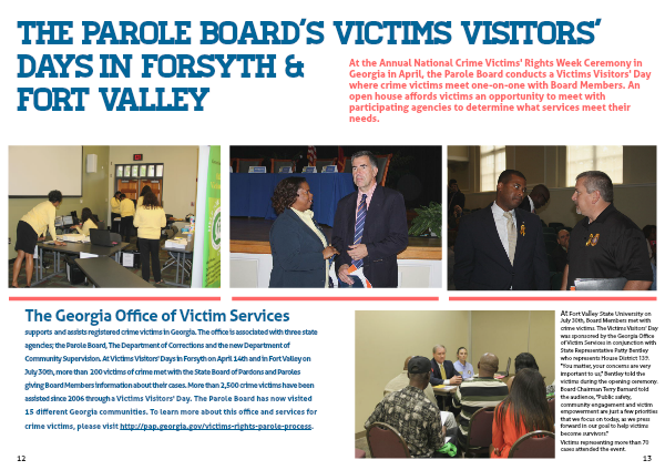 The Georgia Office of Victim Services supports and assists registered crime victims in Georgia. The office is associated with three state agencies; the Parole Board, The Department of Corrections and the new Department of Community Supervision. At Victims Visitors' Days in Forsyth on April 14th and in Fort Valley on July 30th, more than 200 victims of crime met with the State Board of Pardons and Paroles giving Board Members information about their cases. More than 2,500 crime victims have been assisted since 2006 through a Victims Visitors' Day. The Parole Board has now visited 15 different Georgia communities. To learn more about this office and services for crime victims, please visit http://pap.georgia.gov/victims-rights-parole-process.