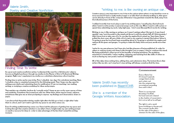 I write for my own pleasure, but I have also had the pleasure of being published. In order for others to read my poetry and share in the thoughts I put on paper, I need to continue this trend. My being published is direct proof of the benefits of writing workshop. The workshop experience is invaluable. I enjoy reading, critiquing, and learning from the skills of others as much as having my own poems read and critiqued.