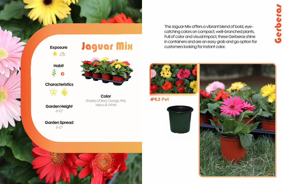 The Jaguar Mix offers a vibrant blend of bold, eyecatching colors on compact, well-branched plants. Full of color and visual impact, these Gerberas shine in containers and are an easy grab and go option for customers looking for instant color.