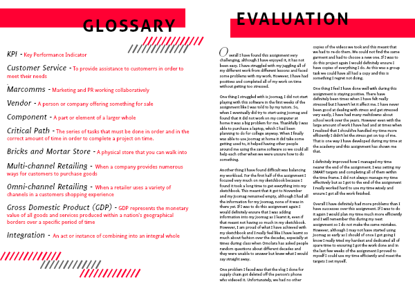 Overall I have found this assignment very challenging, although I have enjoyed it, it has not been easy. I have struggled with my juggling all of my different work from different lessons and faced some problems with my work. However, I have had positives and completed all of my work on time without getting too stressed.