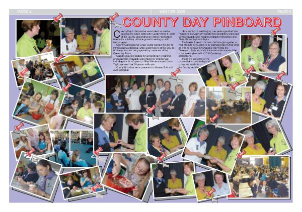 WIN TER 2008 PAGE 4 PAGE 5 C O U N T Y D AY P I N B O A R D ounty Day in September was hailed as another success for Essex West with Guiders from all parts of the County descending on Marks Hall School, Harlow for a full day of trainings and meeting up with friends again. County Commissioner Linda Taylor opened the day by introducing Crystal Bear, while wearing one of the very distinctive polo shirts being sported by members of the Centenary Team. Guiders received badges for completing 10 trainings and a number of awards were made for long service including one for 40 years to Olive Wenborne and Linda Taylor received her 30 years certificate. County Brooches were presented to Moreen Bell and Avril Brampton C Olive Wenborne and Marjory Law were appointed Vice Presidents by County President Avril Brampton, and Good Service awards were made to Margaret Henderson and Chris Skinner by Linda Taylor. The Market Place in the main hall brought together a host of crafts for Guiders to try and take back to their Units as well as displays for Changing The World, the Disneyland Paris trip and information about some of the other events planned for 2010 Centenary celebrations. These are just a few of the pictures taken on the day and others are available on the County website.