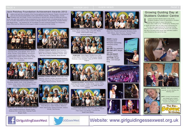 PAGE 4 WINTER 2012 GGEW NEWS Jack Petchey Foundation Achievement Awards 2012 Growing Guiding Day at Stubbers Outdoor Centre eaders and girls from all parts of the County gathered at the Queens Theatre, Hornchurch in June for the annual presentation of the Jack Petchey Awards. Avril Brampton, County President and Jan Knight, County Commissioner opened and closed the glittering evening which saw girls and Leaders being recognised for their achievements in Guiding during the previous 12 months. Entertainment was provided by Megan Warwick, Georgia King, Christina Radikic and Megan Brien. Jan thanked the JP Foundation for their continued support for Girlguiding Essex West and the difference that support makes to everyone in the County. L BRENTWOOD: Jessica Duffy, Sophie Brooking, Natalie Grant, Holly Sedgwick, Lucy Hurst, Linda Caines, Katie McNiven, Penny Walker, Rachel Gooderson. EPPING FOREST NORTH: Alice Commins, Catherine O’Mahony, Amelia Robertson, Ellen Milne, Emma Mason, Madeline Thorpe, Kate Kemmish, Hayley Gamble, Molly Emmett. EPPRING FOREST SOUTH: Caris Jaffe, Kirtsy Mathers, Victoria Lucking, Alexandra Rumsey, Charlotte Flemming, Amy Pickering, Alexandra Pingali, Briony Hockley, Rachel Carr. eaders and their friends spent a day at the Stubbers Outdoor Centre in Upminster in October finding new ways to enjoy themselves. There were crafts to try, a challenging climbing wall to tackle and then time to enjoy some pampering too. The day was organised by the Growing Guiding team of Sarah Collins and Kirsty Hardy who declared the day a success when some new potential Leaders came forward at the end of the day. L NORTH WEST: Chloe Capp, Emilie Hood, Kathryn Coles, Alkice Clayden, Sian O’Rourke, Becky Carter, Jessie Smith, Emily Line, Elizabeth Aspinell. LEADERS:- Nicola Parry, Brentwood; Liz Hannibal, EFN; Janet McNeil, EFS; Valerie Jones, Harlow; Cheryl Mathew, Hornchurch; Lesley Ingham, North West; Pippa Jeffrey, Romford;Dawn Collier, Thurrock East; Sarah Stride, Thurrock West; Helen Hawkes, Upminster. PAGE 5 ROMFORD: Chloe Slater, Amelie Dove, Abbi Jordan-Bland, Victoria Hall, Katie Lewin, Rachel Robinson, Amy Chandler, Ciara Window, Lauren Higgins. THURROCK EAST: Jamiee Britton, Lauren Waller, Chilli Rae McCormack, Caitlyn Smith, Lauren Twaits, Tyler Page, Natalie Vickers, Lucy Miller, Monica Leyland. UPMINSTER: Rebecca Emanuel, Chloe Sims, Molly Finn, Pheobe Hardcastle, Bethany Linnell, Beth Wilson, Alice Thomson, Hannah Wright, Sophie Perry, Francesca Burns. RIGHT, County President Avril Brampton welcoming everyone to the evening. BELOW, The audience BELOW LEFT, Megan Warwick BELOW RIGHT, Christina Radikic BOTTOM, Megan Brien, and Georgia King ABOVE, Glass engraving was popular as was tackling the climbing wall. LEFT, County Commissioner Jan Knight gets a facial courtesy of Epping Forest South’s Sue Wiseman HARLOW: Lily Thomson, Grace Green, Eloise Rust, Sophie Hutchinson, Shazia Copley, Rebecca Gill, Louise Keen, Rachael Pavitt, Megan Heath. HORNCHURCH: Amy Cooper, Emmal Snell, Chloe Browns, Claire Paraboo, Rebecca Ward, Kate Pullen, Amber Perchard, Jessica Moody, Tara Murray. THURROCK WEST: Hannah Gardiner, Megan Stubblesm Beth Winslow, Tyla Lyon, Elouise Russell, Fleur Card, Lucy Dickey, Lucy Murray, Sarah-Jane Bailey. Website: www.girlguidingessexwest.org.uk
