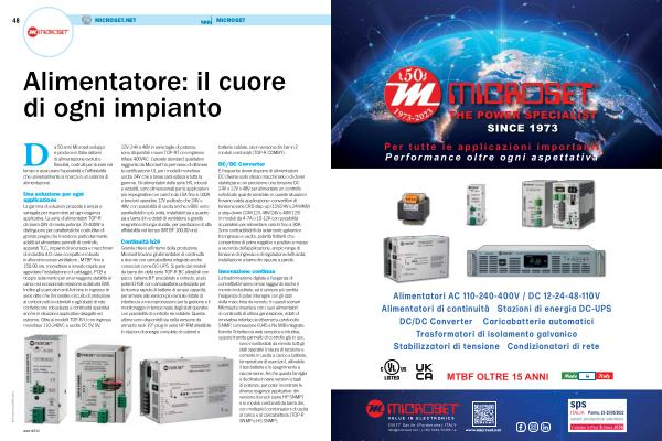 12V , 24V e 48V in varie taglie di potenza , sono disponibili i nuovi TOP-RT con ingresso trifase 400VAC . L ’ elevato standard qualitativo raggiunto da Microset ha permesso di ottenere la certificazione UL per i modelli monofase uscita 24V che a breve sarà estesa a tutta la gamma . Gli alimentatori della serie HS , robusti e versatili , sono dimensionati per le applicazioni più impegnative con carichi da 15A fino a 100A e tensioni operative 12V piuttosto che 24V o 48V , con possibilità di uscita anche a 80V : sono parallellabili in più unità , installabili sia a quadro sia a barra din e dotati di ventilatore a gravità magnetica di lunga durata , per prestazioni di alta affidabilità nel tempo ( MTBF 100.00 ore ).