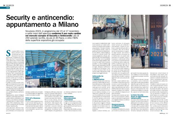 S icurezza 2023 si riconferma primario punto di riferimento per i professionisti di security e antincendio . In programma a Fiera Milano dal 15 al 17 novembre 2023 e forte dell ’ incisivo consenso degli stakeholder di settore , annovera già oggi più di 250 aziende iscritte da 20 Paesi diversi e oltre l ’ 80 % della superficie espositiva già occupata . Tra i brand confermati , inoltre , spiccano importanti ritorni e diverse new entry , che rappresentano il 30 % delle presenze . Tutti i comparti della filiera , dunque , risultano rappresentati , confermando Sicurezza un appuntamento cardine per lo sviluppo di business , il networking e la formazione professionale . È partito con slancio anche il progetto di reclutamento dei top buyer internazionali , che prevede un ’ a- desione da 25 Paesi e soprattutto una rafforzata presenza dall ’ Europa dell ’ Est , dal Bacino del Mediterraneo , da Medio Oriente e da Nord e Sud Africa . Digitalizzazione , sistemi intelligenti integrati e customizzati saranno il filrouge di tutta la manifestazione , per dar voce , e al contempo connettere , i professionisti e le realtà di tutto il settore : TVCC , Antintrusione , Antincendio , Controllo Accessi , Sicurezza Passiva , CyberSecurity . Come ogni anno , sarà ricco il palinsesto formativo , occasione unica per confrontarsi con le soluzioni più