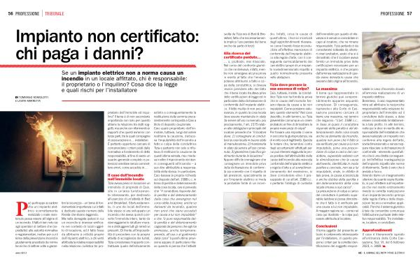 in caso d’ incendio dovuto all’ erronea realizzazione di un impianto elettrico. Beninteso, il caso rappresentato mira ad attribuire le reciproche responsabilità nella relazione tra proprietario dell’ immobile ed il conduttore dello stesso, e deve essere considerato limitatamente a tale profilo. In altri termini, nulla qui si dice in merito alle responsabilità dell’ installatore che aveva realizzato un impianto non conforme alla regola dell’ arte, sovradimensionato e senza neppure rilasciare la dichiarazione di conformità- elemento quest’ ultimo che è una diretta conseguenza dell’ effettiva inadeguatezza dell’ impianto rispetto alle norme di riferimento. Tanto è vero che è andato a fuoco. Volendo trarre un insegnamento ulteriore da quanto sopra illustrato, si può riflettere sull’ importanza che nel nostro ordinamento riveste la corretta realizzazione di un impianto secondo i principi della regola d’ arte e delle disposizioni tecnico-normative applicabili. Perché il sistema giuridico è tale da consentire comunque l’ attribuzione puntuale delle relative responsabilità. Tra installatore, locatore, e conduttore.