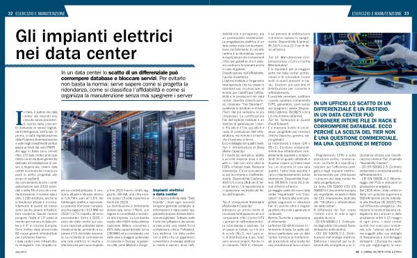 ESERCIZIO E MANUTENZIONE 33 dabilità non è un’ opzione, ma un prerequisito esistenziale. La progettazione elettrica di un data center inizia con la prevenzione del fallimento. Il concetto cardine è la ridondanza, ovvero la duplicazione dei componenti critici per garantire che il sistema continui a funzionare anche in caso di guasto. Classificazione dell’ affidabilità: il punto di partenza L’ Uptime Institute è l’ organismo internazionale che ha creato lo standard più riconosciuto al mondo per classificare l’ affidabilità e le prestazioni dei data center. Questa classificazione, chiamata“ Tier Standard”, suddivide le strutture in 4 livelli( Tier), dal più semplice al più complesso. La certificazione Tier dell’ Uptime Institute è un marchio di garanzia per i clienti. Più alto è il Tier, più alto è il costo di costruzione dell’ infrastruttura, ma minore è il rischio che il business si fermi. Ecco il dettaglio dei quattro livelli: Tier I: Infrastruttura di Base( Basic Capacity) È il livello più semplice, adatto a piccole imprese dove il sito web o i dati non sono vitali al 100 % in tempo reale. Nessuna ridondanza. C’ è un solo percorso per la corrente e il raffreddamento. Disponibilità( Uptime): 99,671 %( circa 28,8 ore di fermo all’ anno). La manutenzione o riparazione necessita del fermo dell’ impianto.