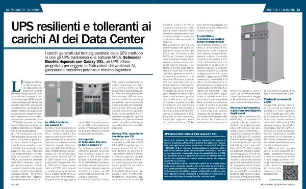 62040-3, contro il 97,5 % in doppia conversione tradizionale, valori ottenibili nelle condizioni operative reali, con risparmi energetici misurabili e riduzione delle emissioni di carbonio. Nella gestione dei carichi estremi Galaxy VXL opera sostenendo sovraccarichi del 125 % per 10 minuti e del 150 % per 1 minuto. La topologia brevettata integra eConversion e doppia conversione senza switch manuali: il sistema commuta automaticamente in base alle condizioni operative, garantendo sempre la massima protezione e la massima efficienza. L’ operatore non deve fare nulla. Le batterie agli ioni di litio rappresentano l’ opzione preferenziale rispetto alle VRLA: mantengono prestazioni stabili anche sotto stress estremo, gestendo con efficacia i cicli rapidi di scarica e ricarica tipici dei workload AI, con una durata di vita da 2 a 3 volte superiore che riduce drasticamente frequenza di sostituzione e TCO. Dal punto di vista costruttivo, Galaxy VXL supporta correnti di cortocircuito fino a 100 kA e può essere equipaggiato con kit antisismici per installazioni in zone a rischio.