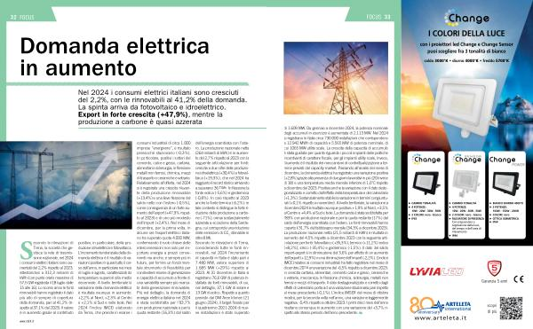 33 di 1.609 MW . Da gennaio a dicembre 2024 , la potenza nominale degli accumuli in esercizio è aumentata di 2.113 MW . Nel 2024 si registrano in Italia circa 730.000 installazioni che corrispondono a 12.942 MWh di capacità e 5.565 MW di potenza nominale , di cui 1065 MW utility scale . La crescita della capacità di accumulo è stata guidata per quanto riguarda i piccoli impianti dalle politiche incentivanti di carattere fiscale , per gli impianti utility scale , invece , l ’ aumento è il risultato dei meccanismi di contrattualizzazione a termine previsti dal capacity market . Passando all ’ analisi del mese di dicembre , la domanda elettrica ha registrato una variazione positiva (+ 2,8 %) grazie alla presenza di due giorni lavorativi in più ( 20 invece di 18 ) e una temperatura media mensile inferiore di 1,6 ° C rispetto a dicembre del 2023 . Positiva anche la variazione con il dato destagionalizzato e corretto dall ’ effetto della temperatura e del calendario (+ 1,3 %). Sostanzialmente stabile la variazione in termini congiunturali (+ 0,1 % rispetto a novembre ). A livello territoriale , la variazione a dicembre 2024 è risultata ovunque positiva : + 1,9 % al Nord , + 3,5 % al Centro e + 4,4 % al Sud e Isole . La domanda è stata soddisfatta per l ’ 83 % con produzione nazionale e per la quota restante ( 17 %) dal saldo dell ’ energia scambiata con l ’ estero . Le fonti rinnovabili hanno coperto il 31,7 % del fabbisogno mensile ( 34,3 % a dicembre 2023 ). La produzione nazionale netta ( 21,5 miliardi di kWh ) è risultata in aumento del 4,5 % rispetto a dicembre 2023 con la seguente articolazione per fonti : fotovoltaico (+ 35,3 %), termico (+ 11,2 %) eolico (+ 8,2 %), idrico ( -35,4 %) e geotermico ( -1,5 %). Il dato del saldo import-export è in diminuzione del 3,6 % per effetto di un aumento dell ’ export (+ 12,9 %) e una diminuzione dell ’ import ( -2,2 %). L ’ indice IMCEI relativo ai consumi industriali ha fatto registrare nel mese di dicembre 2024 una variazione del -6,5 % rispetto a dicembre 2023 : in crescita cartaria , alimentari , cemento calce e gesso , ceramiche e vetrarie , meccanica ; in flessione chimica , siderurgia , metalli non ferrosi e mezzi di trasporto . Il dato destagionalizzato e corretto dagli effetti di calendario porta ad una variazione stazionaria pari rispetto al mese precedente ( -0,1 %). L ’ indice IMSER del mese di ottobre mostra , per la seconda volta nell ’ anno , una variazione leggermente negativa : -0,4 % rispetto a ottobre 2023 . I primi dieci mesi dell ’ anno risultano comunque in aumento con una variazione del + 3,7 % rispetto allo stesso periodo dell ’ anno precedente .