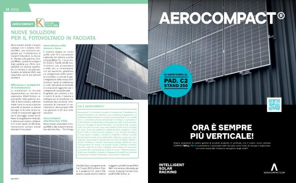 Aerocompact amplia il proprio catalogo con il sistema CompactWall , una soluzione progettata per l ’ installazione di impianti fotovoltaici su facciate . Basata sulla gamma CompactMetal , questa tecnologia è stata adattata per offrire compatibilità con diverse superfici , tra cui lamiera e calcestruzzo . A partire da febbraio 2025 , sarà disponibile anche per pannelli sandwich .