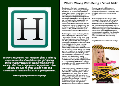 How ironic is it that I live in a culture that gives both girls and boys an equal right to education and our society does not even advocate for girls being smart. In Nigeria, where education for girls is considered a rare privilege, 234 girls between 16 and 18 years old were stolen from a school in Chibok, a small town in Borno state in northeastern Nigeria. The girls were kidnapped during a physics test. The Boko Haram group only publicly claimed responsibility on May 5, with leader Abubakar Shekau saying, "I abducted your girls. I will sell them in the market, by Allah."