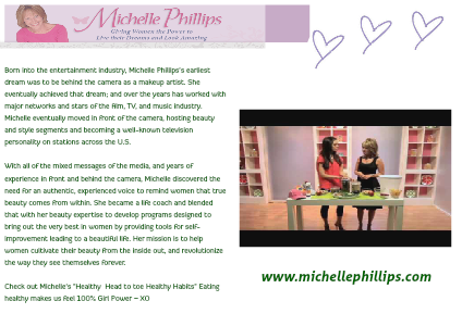 Born into the entertainment industry, Michelle Phillips’s earliest dream was to be behind the camera as a makeup artist. She eventually achieved that dream; and over the years has worked with major networks and stars of the film, TV, and music industry. Michelle eventually moved in front of the camera, hosting beauty and style segments and becoming a well-known television personality on stations across the U.S.