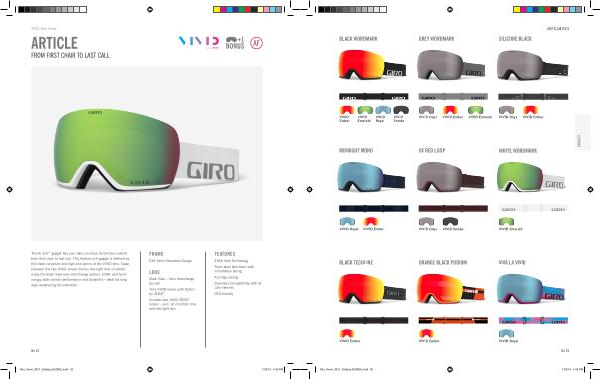 No 25 GOGGLES BLACK WORDMARK GREY WORDMARK VIVID Ember 7094209 VIVID Ember 7111179 VIVID Onyx 7094191 VIVID Onyx 7094589 VIVID Emerald 7094210 MIDNIGHT MONO OX RED LOOP VIVID Onyx 7119541 BLACK TECHLINE VIVID Ember 7119538 ORANGE BLACK PODIUM VIVID Ember 7119543 VIVA LA VIVID VIVID Royal 7119542 WHITE WORDMARK VIVID Emerald 7102777 SILICONE BLACK VIVID Emerald 7094207 VIVID Ember 7094188 VIVID Royal 7094208 VIVID Smoke 7121614 VIVID Ember 7119539 VIVID Royal 7119540 VIVID Smoke 7121615 Giro _ Snow _ 2021 _ Catalog-GLOBAL . indd 25 Giro _ Snow _ 2021 _ Catalog-GLOBAL . indd 25 12 / 3 / 19 4:42 PM 12 / 3 / 19 4:42 PM