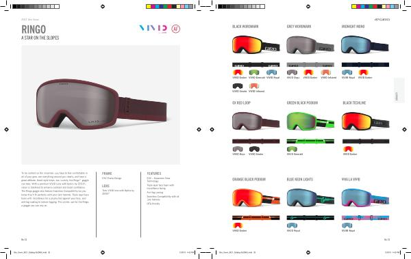 No 33 GOGGLES BLACK WORDMARK VIVID Emerald 7105810 VIVID Infrared 7108788 VIVID Ember 7105410 VIVID Smoke 7121628 VIVID Royal 7105811 GREY WORDMARK VIVID Ember 7105812 VIVID Onyx 7105413 VIVID Infrared 7108789 MIDNIGHT MONO OX RED LOOP GREEN BLACK PODIUM VIVID Emerald 7119643 VIVID Ember 7119641 BLACK TECHLINE ORANGE BLACK PODIUM VIVID Ember 7119646 BLUE NEON LIGHTS VIVID Royal 7119648 VIVA LA VIVID VIVID Royal 7105415 VIVID Ember 7119644 VIVID Royal 7119645 VIVID Smoke 7121629 VIVID Onyx 7119647 Giro _ Snow _ 2021 _ Catalog-GLOBAL . indd 33 Giro _ Snow _ 2021 _ Catalog-GLOBAL . indd 33 12 / 3 / 19 4:42 PM 12 / 3 / 19 4:42 PM