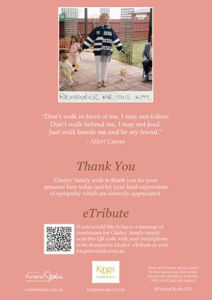 If you would like to leave a message of condolence for Gladys ’ family simply scan this QR code with your smartphone to be directed to Gladys ’ eTribute or visit kingsfunerals . com . au