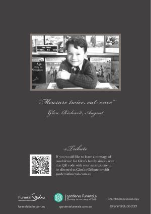 If you would like to leave a message of condolence for Glen ’ s family simply scan this QR code with your smartphone to be directed to Glen ’ s eTribute or visit gardeniafunerals . com . au