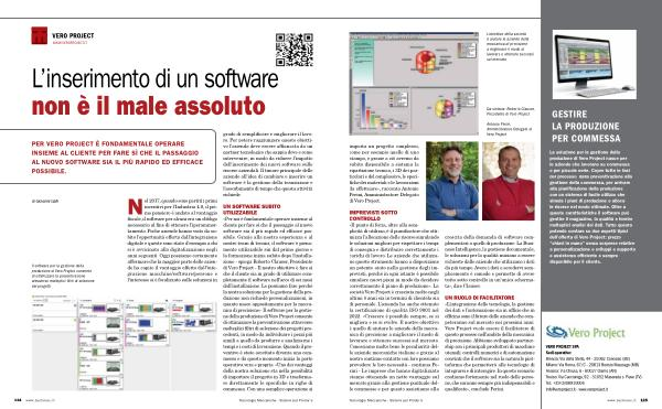« Per noi è fondamentale operare insieme al cliente per fare sì che il passaggio al nuovo software sia il più rapido ed efficace possibile . Grazie alla nostra esperienza e al nostro team di tecnici , il software è pienamente utilizzabile sin dal primo giorno e la formazione inizia subito dopo l ’ installazione - spiega Roberto Clauser , Presidente di Vero Project - Il nostro obiettivo è fare sì che il cliente sia in grado di utilizzare completamente il software nell ’ arco di sei mesi dall ’ installazione . Lo possiamo fare perché la nostra soluzione per la gestione della produzione non richiede personalizzazioni , in quanto nasce appositamente per la meccanica di precisione ». Il software per la gestione della produzione di Vero Project consente di ottimizzare la preventivazione attraverso molteplici filtri di selezione dei progetti precedenti , in modo da individuare i pezzi più simili a quello da produrre e analizzarne i tempi e i costi di lavorazione . Quando il preventivo è stato accettato diventa una commessa e da questo momento inizia la parte operativa vera e propria . « Uno dei vantaggi della nostra soluzione sta nella possibilità di importare il progetto in 3D e trasformare direttamente le specifiche in righe di commessa . Con una semplice operazione si