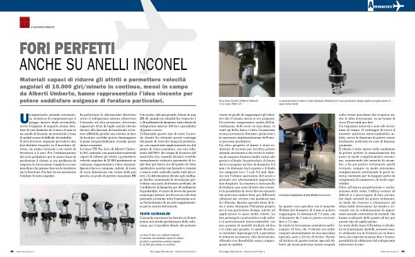 sulla stessa macchina che eseguiva anche le altre lavorazioni , in un tempo di circa 30 secondi per foro . Un risparmio notevole e non solo in termini di tempo . Il vantaggio di avere il musetto anteriore intercambiabile , infatti , aveva la funzione di potere essere facilmente sostituito in caso di danneggiamento . Il cliente è stato messo nella condizione di potere gestire la manutenzione dei pezzi in modo completamente autonomo , acquistando dei musetti di ricambio , e ha poi potuto revisionare quelli rovinati , sempre in modo autonomo , semplicemente sostituendo le parti interne , costituite per la maggior parte da componenti di commercio , di facile reperibilità . Oltre all ’ intera progettazione e realizzazione delle teste , l ’ ufficio tecnico di Alberti si è preoccupato di fare un ’ analisi degli utensili da potere utilizzare , in modo da riuscire a ottimizzare gli sforzi delle lavorazioni . Lo studio è avvenuto con la collaborazione di importanti aziende costruttrici di utensili , che hanno realizzato delle punte ad hoc per questo tipo di applicazione . Le teste della linea Ultraslim si dividono in 2 principali modelli , possono essere utilizzate sia in foratura sia in fresatura , con capacità in pinza fino a 6 mm e possibilità di adduzione del refrigerante attraverso il cono .