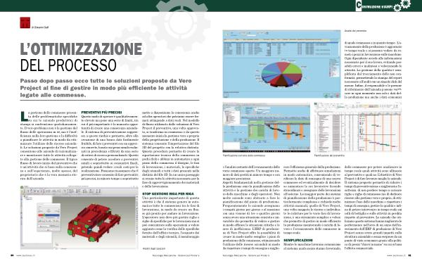 SEMPLIFICAZIONI Mentre le macchine lavorano comunicano al sistema quale pezzo stanno lavorando , delle commesse per potere analizzare in tempo reale quali attività sono allineate al preventivo e quali no . L ’ obiettivo di Vero Project è di fare lavorare meglio le aziende . Il sistema proposto permette di ridurre i tempi di preventivazione e migliorarne l ’ e- sattezza , di non perdere tempo a caricare righe e righe di commessa ma di dedicare risorse alla gestione vera e propria , di ottimizzare l ’ uso delle macchine e rispettare i tempi di consegna , gestire la qualità e infine di potere intervenire in tempo reale sui colli di bottiglia e sulle attività in perdita rispetto al preventivo . Le aziende che utilizzano questo sistema hanno migliorato le performance nell ’ arco di un anno dall ’ inserimento dell ’ ERP di produzione di Vero Project senza avere grandi impatti sulla struttura aziendale e senza sorprese da un punto di vista economico grazie alla politica di prezzi “ chiavi in mano ” su cui si basa l ’ offerta commerciale .