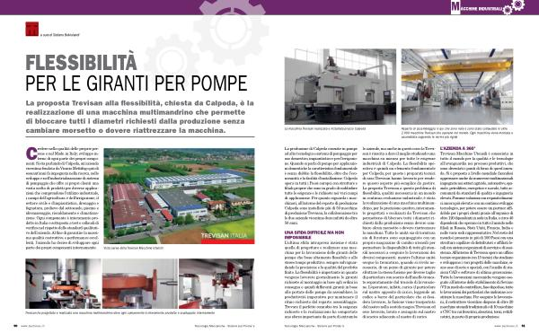 L ’ ultima sfida intrapresa insieme è stata quella di progettare e realizzare una macchina per la lavorazione delle giranti delle pompe che fosse altamente flessibile e allo stesso tempo produttiva , sempre salvaguardando la precisione e la qualità del prodotto finito . La flessibilità è importante in quanto vengono lavorate giornalmente le giranti richieste al montaggio in base agli ordini in consegna e quindi differenti giranti in base alle portate delle pompe da assemblare , la produttività imperativa per mantenere il ritmo richiesto dal reparto assemblaggio . Trovare il perfetto connubio tra le esigenze richieste e la realizzazione ha comportato uno sforzo importante da parte di entrambe le aziende , ma anche in questo caso la Trevisan è riuscita a dare il meglio studiando una macchina su misura per tutte le esigenze industriali di Calpeda . La flessibilità operativa è quindi un elemento fondamentale per Calpeda ; per questo i preparati tecnici di casa Trevisan hanno lavorato per rendere questo aspetto più semplice da gestire . La proposta Trevisan a questo problema di flessibilità , qualità necessaria in un mondo in continua evoluzione industriale , è stata la realizzazione di una macchina multimandrino , per la precisione quattro , interamente progettati e realizzati da Trevisan che permettono di bloccare tutti i diametri richiesti dalla produzione senza dovere cambiare alcun morsetto o dovere riattrezzare la macchina . Tutte le unità sia di tornitura sia di foratura sono equipaggiate con un proprio magazzino di cambio utensili per permettere la disponibilità di tutti gli utensili necessari a eseguire le lavorazioni dei diversi componenti , mentre l ’ ultima unità esegue la troncatura , quando si rivela necessaria , di un pezzo di girante per potere sfruttare la stessa fusione per diverse taglie di particolare con scarico dell ’ anello troncato separatamente dal truciolo di lavorazione . L ’ operatore , infatti , carica il particolare sul nastro apposito di carico , leggendo un codice a barre del particolare che si desidera lavorare , la fusione viene trasportata dal nastro nella scatola magica Trevisan ed esce lavorato , lavato e asciugato sul nastro di scarico adiacente al nastro di carico .