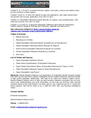 Market Overview Manufacturers Profiles Global Disposable Tableware Market Competitions, by Manufacturer Global Disposable Tableware Market Analyses by Regions North America Disposable Tableware Analyses by Countries Europe Disposable Tableware Analyses by Countries And more …