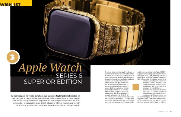 Y es que , si un reloj de Apple ya de por sí es un artículo de una calidad indiscutible , el toque de Goldstriker International lo convierte en un artículo de lujo . Hablamos de un reloj con un marco único realizado a mano , de apariencia clásica y adornado en oro , que cuenta con un brazalete chapado también en oro de 24 quilates y grabado a mano . Toda una pieza de joyería que hará las delicias de los amantes de lo exclusivo . Apple ya hizo saber que a partir del 18 de septiembre estaría a la venta la Serie 6 de sus relojes , en materiales como aluminio , titanio y acero inoxidable . La sorpresa ha sido poder encontrarnos con esta versión en oro de este artículo . Si quieres preordenar la compra de tu propio Apple SERIES 6 Superior Edition , ya puedes hacerlo por un precio de unos 7.800 dólares y con certificado de autenticidad . Viene en 44mm con GPS más celular . La caja en la que viene este reloj , creada en madera , contribuye a añadirle elegancia . Cabe destacar también su carga rápida y su batería , que se dice que tiene una duración de 18 horas . Lo cierto es que cuando se unen la tecnología y la joyería , a menudo dan lugar a creaciones realmente exquisitas . Y si hablamos de una marca como Apple , en alianza con una casa de joyería como Goldstriker International , el resultado no podía más que alcanzar el nivel del Apple SERIES 6 Superior Edition .