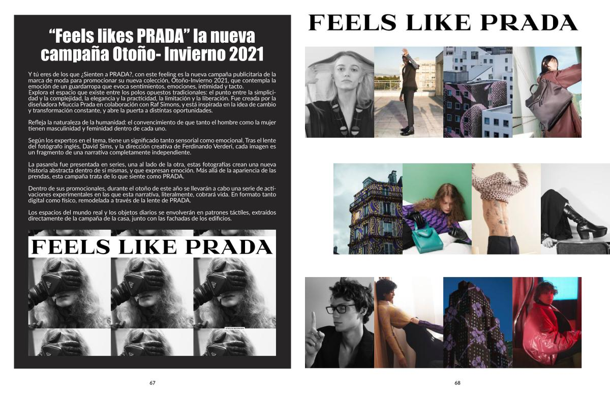 Y tú eres de los que ¿ Sienten a PRADA?, con este feeling es la nueva campaña publicitaria de la marca de moda para promocionar su nueva colección, Otoño-Invierno 2021, que contempla la emoción de un guardarropa que evoca sentimientos, emociones, intimidad y tacto. Explora el espacio que existe entre los polos opuestos tradicionales: el punto entre la simplicidad y la complejidad, la elegancia y la practicidad, la limitación y la liberación. Fue creada por la diseñadora Miuccia Prada en colaboración con Raf Simons, y está inspirada en la idea de cambio y transformación constante, y abre la puerta a distintas oportunidades.