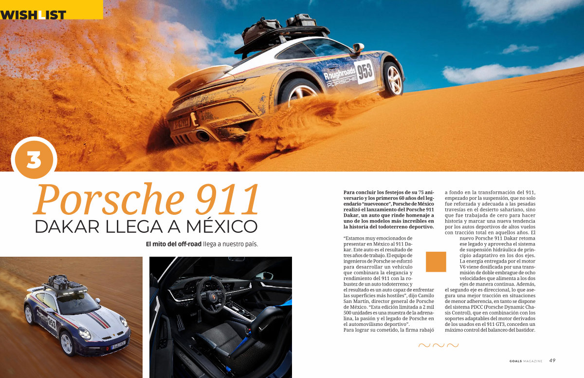 “ Estamos muy emocionados de presentar en México al 911 Dakar. Este auto es el resultado de tres años de trabajo. El equipo de ingenieros de Porsche se esforzó para desarrollar un vehículo que combinara la elegancia y rendimiento del 911 con la robustez de un auto todoterreno; y el resultado es un auto capaz de enfrentar las superficies más hostiles”, dijo Camilo San Martín, director general de Porsche de México.“ Esta edición limitada a 2 mil 500 unidades es una muestra de la adrenalina, la pasión y el legado de Porsche en el automovilismo deportivo”. Para lograr su cometido, la firma rabajó