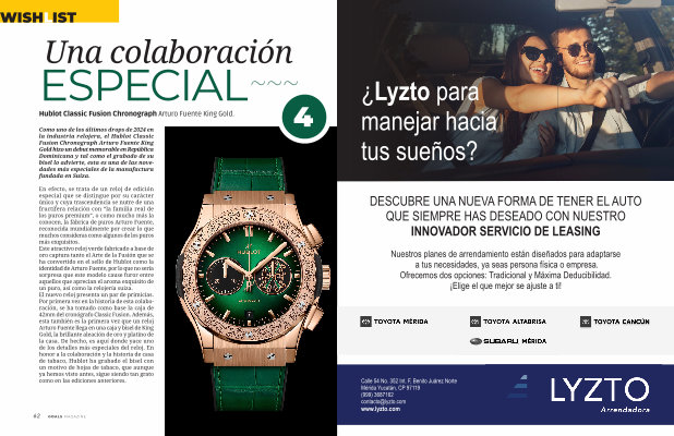 En efecto , se trata de un reloj de edición especial que se distingue por su carácter único y cuya trascendencia se nutre de una fructífera relación con “ la familia real de los puros premium ”, o como mucho más la conocen , la fábrica de puros Arturo Fuente , reconocida mundialmente por crear lo que muchos consideras como algunos de los puros más exquisitos . Este atractivo reloj verde fabricado a base de oro captura tanto el Arte de la Fusión que se ha convertido en el sello de Hublot como la identidad de Arturo Fuente , por lo que no sería sorpresa que este modelo cause furor entre aquellos que aprecian el aroma exquisito de un puro , así como la relojería suiza . El nuevo reloj presenta un par de primicias . Por primera vez en la historia de esta colaboración , se ha tomado como base la caja de 42mm del cronógrafo Classic Fusion . Además , esta también es la primera vez que un reloj Arturo Fuente llega en una caja y bisel de King Gold , la brillante aleación de oro y platino de la casa . De hecho , es aquí donde yace uno de los detalles más especiales del reloj . En honor a la colaboración y la historia de casa de tabaco , Hublot ha grabado el bisel con un motivo de hojas de tabaco , que aunque ya hemos visto antes , sigue siendo tan grato como en las ediciones anteriores .