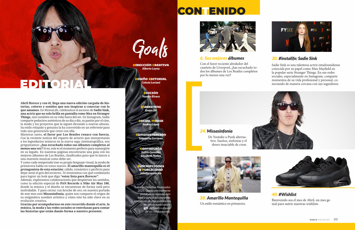 Abril florece y con él, llega una nueva edición cargada de historias, colores y sonidos que nos inspiran a conectar con lo que amamos. En # InstaLife, celebramos el ascenso de Sadie Sink, una actriz que no solo brilla en pantalla como Max en Stranger Things, sino también en su vida fuera del set. En Instagram, Sadie comparte pedacitos auténticos de su día a día, su pasión por el cine, la moda y los proyectos que la siguen llevando a nuevas alturas. Su estilo relajado y genuino la ha convertido en un referente para toda una generación que crece con ella. Mientras tanto, el furor por Los Beatles renace con fuerza. Con la reciente noticia del reparto de actores que interpretarán a los legendarios músicos en la nueva saga cinematográfica, nos preguntamos: ¿ has escuchado todos sus álbumes completos al menos una vez? Si no, este es el momento perfecto para sumergirte en su legado. En nuestras páginas encontrarás una guía con los mejores álbumes de Los Beatles, clasificados para que te lances a una maratón musical como debe ser. Y como cada temporada trae su propio lenguaje visual, la moda de primavera habla en tonos suaves. El amarillo mantequilla es el protagonista de esta estación: cálido, romántico y perfecto para dejar atrás el gris del invierno. Te mostramos con qué combinarlo para lograr un look que diga“ estoy lista para florecer”. Además, exploramos colaboraciones que despiertan los sentidos, como la edición especial de PAN Records x Nike Air Max 180, donde la música y el diseño se encuentran de forma sutil pero inolvidable. Y para cerrar con broche de oro, en nuestra portada de este mes está Missasinfonía, quien nos comparte el origen de su enigmático nombre artístico y cómo este ha sido clave en su evolución creativa. Gracias por acompañarnos en este recorrido donde el arte, la música, la moda y las redes sociales se entrelazan para contar las historias que están dando forma a nuestro presente.