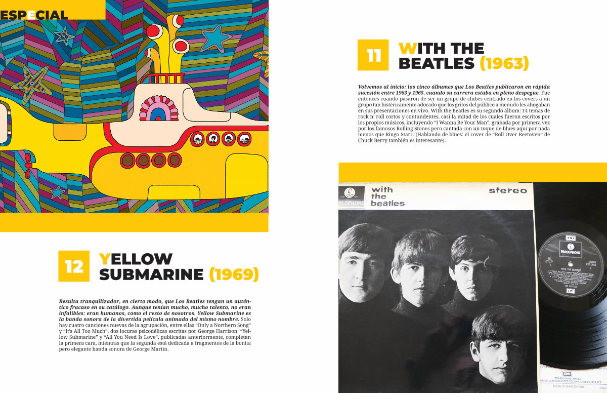Volvemos al inicio: los cinco álbumes que Los Beatles publicaron en rápida sucesión entre 1963 y 1965, cuando su carrera estaba en pleno despegue. Fue entonces cuando pasaron de ser un grupo de clubes centrado en los covers a un grupo tan histéricamente adorado que los gritos del público a menudo les ahogaban en sus presentaciones en vivo. With the Beatles es su segundo álbum: 14 temas de rock n’ roll cortos y contundentes, casi la mitad de los cuales fueron escritos por los propios músicos, incluyendo“ I Wanna Be Your Man”, grabada por primera vez por los famosos Rolling Stones pero cantada con un toque de blues aquí por nada menos que Ringo Starr.( Hablando de blues: el cover de“ Roll Over Beetoven” de Chuck Berry también es interesante).