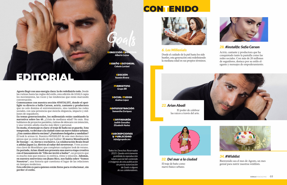 Agosto llegó con una energía clara: la de redefinirlo todo. Desde las rutinas hasta las reglas del estilo, esta edición de GOALS capta los movimientos, las voces y las tendencias que están marcando conversación. Comenzamos con nuestra sección # INSTALIFE, donde el spotlight va directo a Sofía Carson, actriz, cantante y productora que no solo domina el entretenimiento, sino también las redes sociales, con una presencia que mezcla elegancia, impacto y millones de seguidores. En temas generacionales, los millennials están cambiando la narrativa sobre los 40. ¿ Crisis de mediana edad? No más. Hoy hablamos de proyectos paralelos, rutinas de skincare con intención, y una versión adulta mucho más libre y personal. En moda, el mensaje es claro: el traje de baño no se guarda. Esta temporada, va del mar a la ciudad como un nuevo básico urbano. ¿ Una camisa abierta encima? ¿ Pantalones holgados y sandalias? El look lo armas tú. Nuestra # WISHLIST de este mes destaca tres piezas que ya están dando de qué hablar: El nuevo MoonSwatch de Snoopy— sí, tierno y exclusivo. La colaboración Brain Dead x adidas Japan Lo, directo al radar del streetwear. Y tres accesorios clave de Montblanc que completan cualquier look de verano. En portada, Arian Abadi nos presenta una nueva etapa creativa con el lanzamiento de“ Ella me invitó a bailar”, un proyecto que es mucho más que música: es estética, ritmo y emoción. Además, en nuestra entrevista con Jhans Rico, nos habla sobre“ Somos Nosotros”, una historia que cuestiona el lugar de las relaciones en tiempos modernos. Esta edición es para quienes están listos para evolucionar, sin perder el estilo.