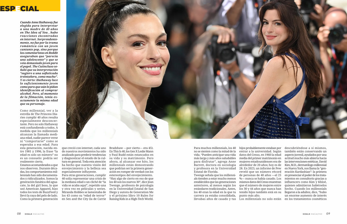Para muchos millennials, los 40 no se sienten como la mitad de la vida.“ Pueden anticipar una vida más larga y más años saludables para disfrutar”, agrega Anne Barrett, doctora en sociología y profesora en la Universidad Estatal de Florida. Twenge señala que los millennials tienden a estar mucho menos establecidos que las generaciones anteriores, al menos según los estándares tradicionales. Antes, los 40 eran la edad en la que tu carrera ya estaba consolidada, llevabas años de casado y tus hijos probablemente estaban por entrar a la universidad. Según datos del Censo, en 1960 la edad media del primer matrimonio en mujeres estadounidenses era de alrededor de 20 años; hoy es de 28. En 2023, un informe de Pew reveló que un número récord de personas de 40 años— el 25 %— nunca se había casado. Los mismos datos del Censo muestran que el número de mujeres entre los 30 y 44 años que nunca han tenido hijos también está en su punto más alto. Los millennials no solo están descubriéndose a sí mismos, también están conservando un aspecto juvenil, ayudados por una actitud mucho más abierta hacia las intervenciones estéticas. David Kim, M. D., dermatólogo millennial en Nueva York, nos llama la“ generación Kardashian”: la primera en presenciar el poder de los tratamientos en consultorio gracias a influencers como Kim y Khloé, quienes admitieron habérselos hecho. Cuando los millennials llegaron a la adultez, dice,“ hubo un enorme aumento de interés en los tratamientos cosméticos