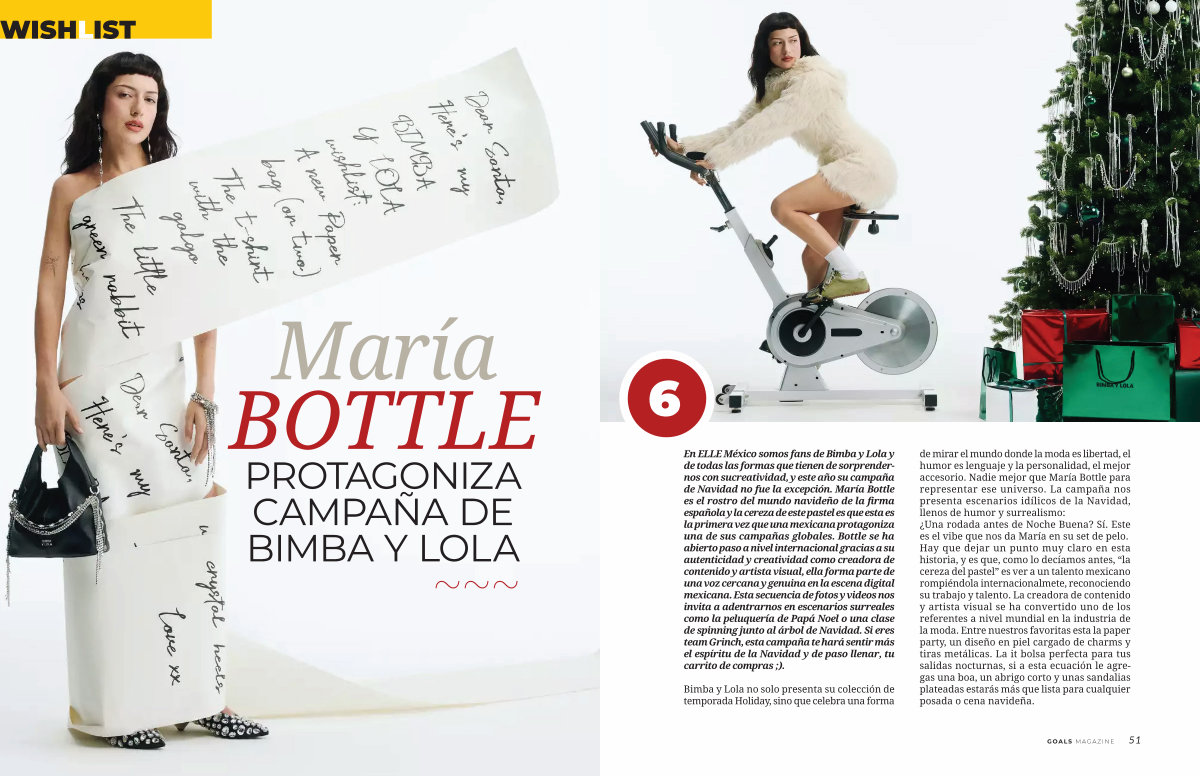 En ELLE México somos fans de Bimba y Lola y de todas las formas que tienen de sorprendernos con sucreatividad, y este año su campaña de Navidad no fue la excepción. María Bottle es el rostro del mundo navideño de la firma española y la cereza de este pastel es que esta es la primera vez que una mexicana protagoniza una de sus campañas globales. Bottle se ha abierto paso a nivel internacional gracias a su autenticidad y creatividad como creadora de contenido y artista visual, ella forma parte de una voz cercana y genuina en la escena digital mexicana. Esta secuencia de fotos y videos nos invita a adentrarnos en escenarios surreales como la peluquería de Papá Noel o una clase de spinning junto al árbol de Navidad. Si eres team Grinch, esta campaña te hará sentir más el espíritu de la Navidad y de paso llenar, tu carrito de compras;).